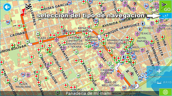 Seleccion del tipo de navegacion. Presiona el boton azul indicado en la imagen para seleccionar el tipo de navegacion hacia el punto.