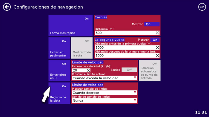 Configuraciones > Navegacion > Registro de la pista (tiene que estar azul). Despues del grabar el track necesario, no se le olvida volver a este menu y apagarlo, presionando una vez (se pone gris)