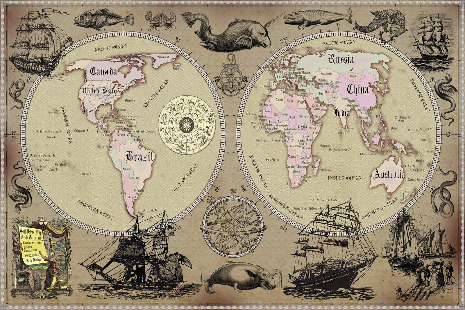 Each map in this collection combines antique cartographic aesthetics with precise modern production standards — delivering sharp typography, balanced continental proportions, and refined decorative details.