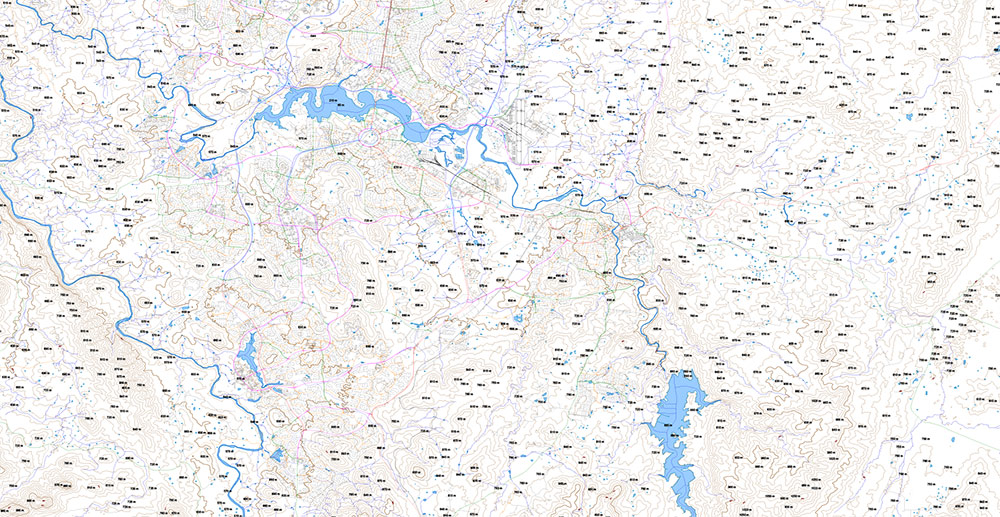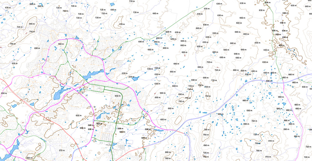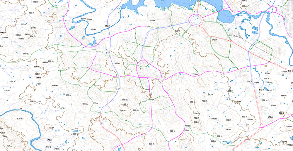 All streets and roads, Water objects, Height Relief Isolines 30 m, Elevation points in meters. Map for design, laser cutting, 3D printing, arts, projects, presentations, for architects, designers, and builders, business, logistics.