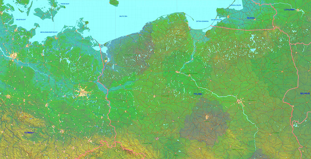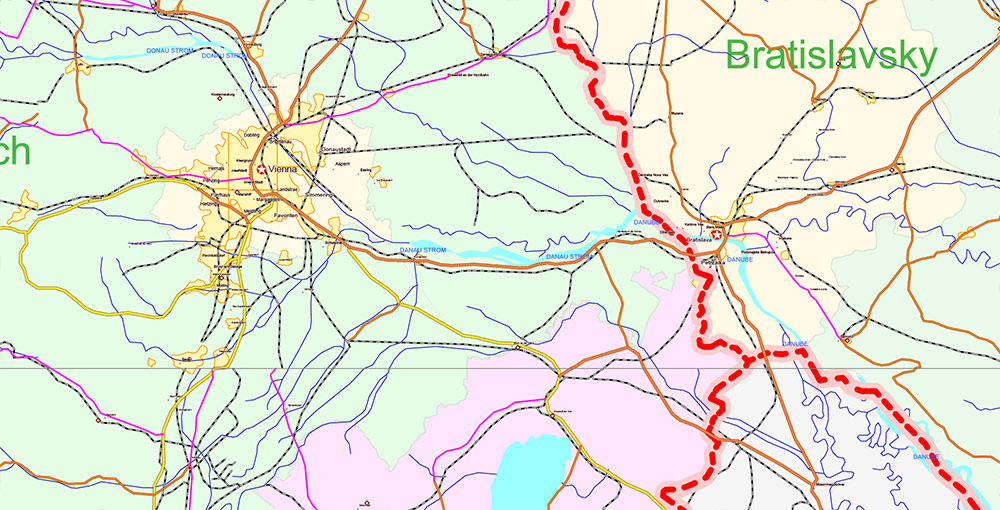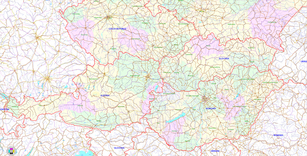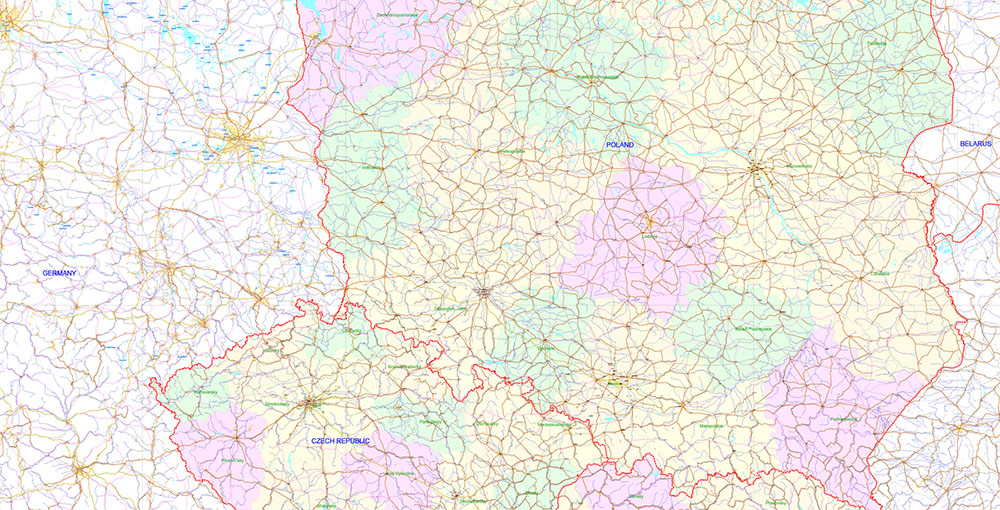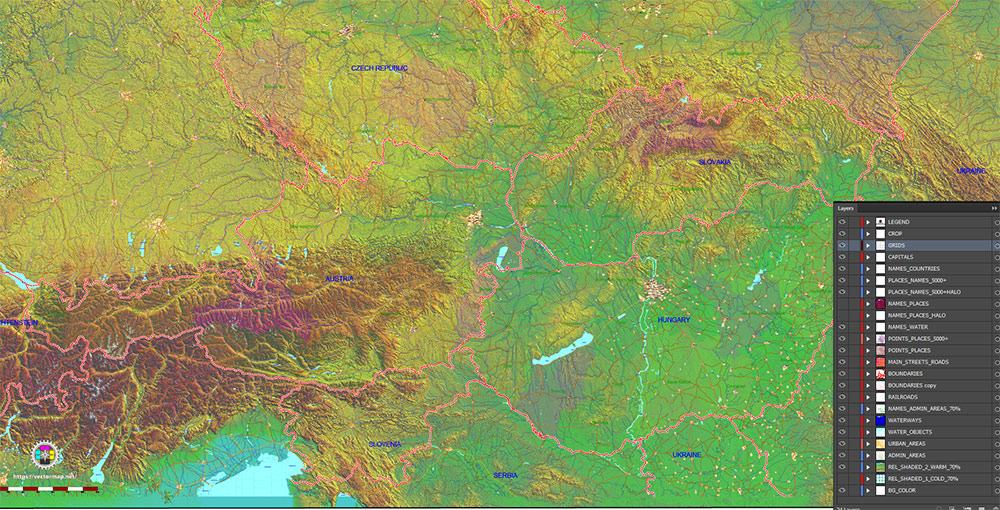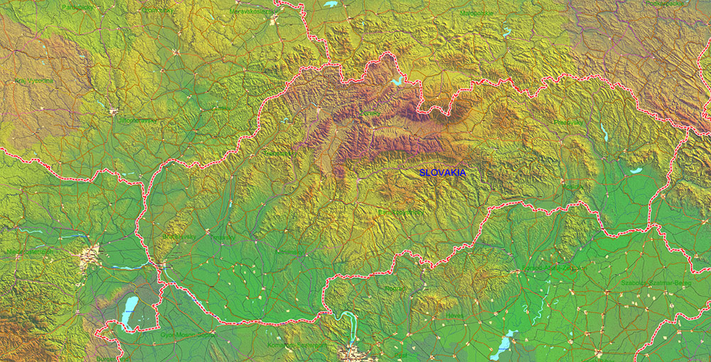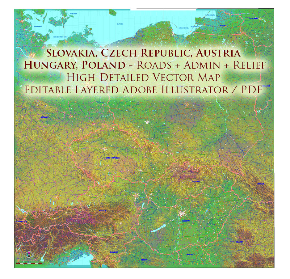 Printable Europe Central: Slovakia, Czech Republic, Austria, Hungary, Poland, – Roads, Relief and Admin High Detailed Map in Mercator Projection fully editable, Adobe Illustrator in layers, full vector, scalable, curves/text format names, 720 mb ZIP