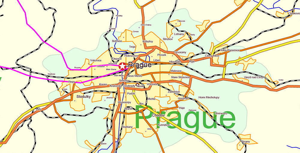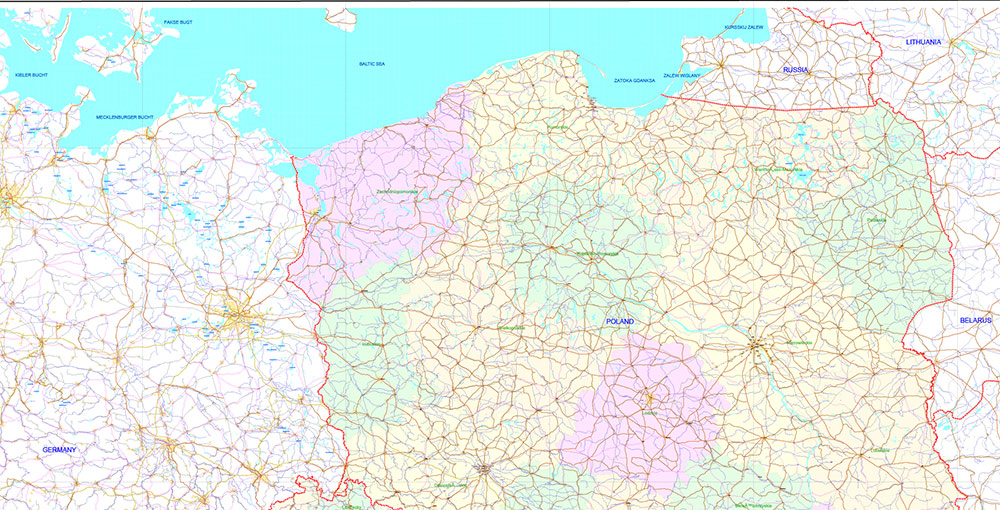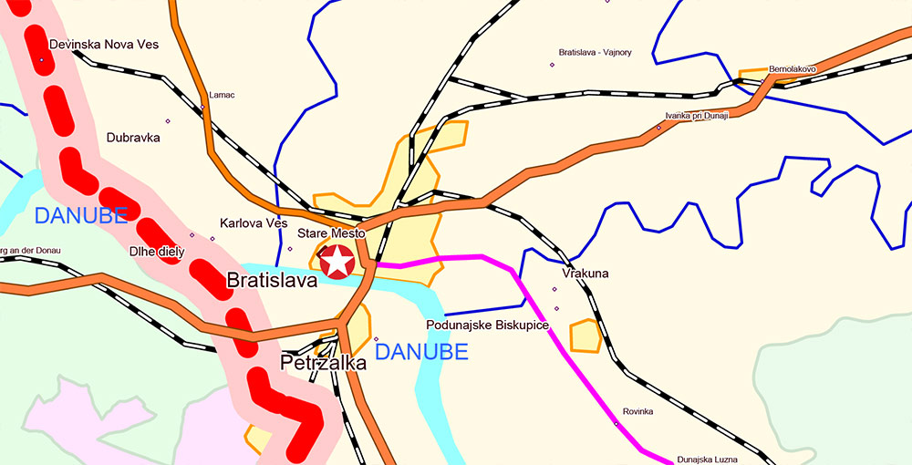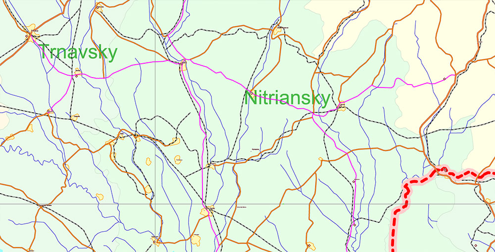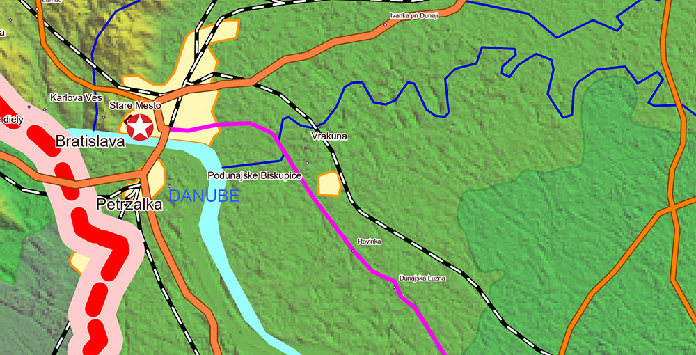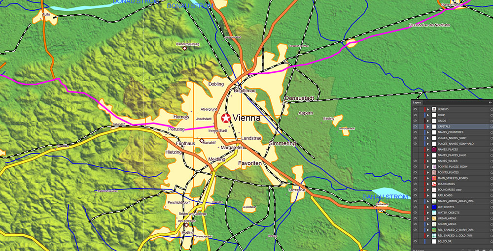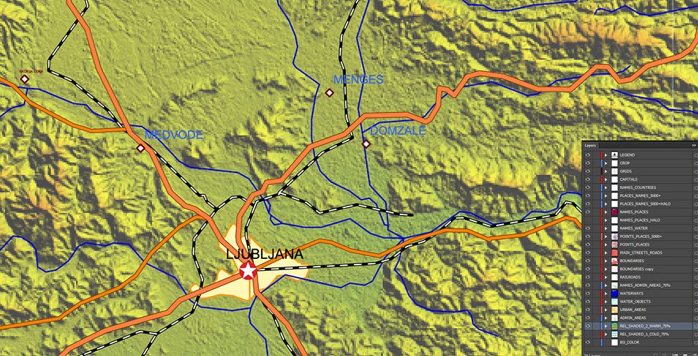 Printable Europe Central: Slovakia, Czech Republic, Austria, Hungary, Poland, – Roads, Relief and Admin High Detailed Map in Mercator Projection fully editable, Adobe Illustrator in layers, full vector, scalable, curves/text format names, 720 mb ZIP