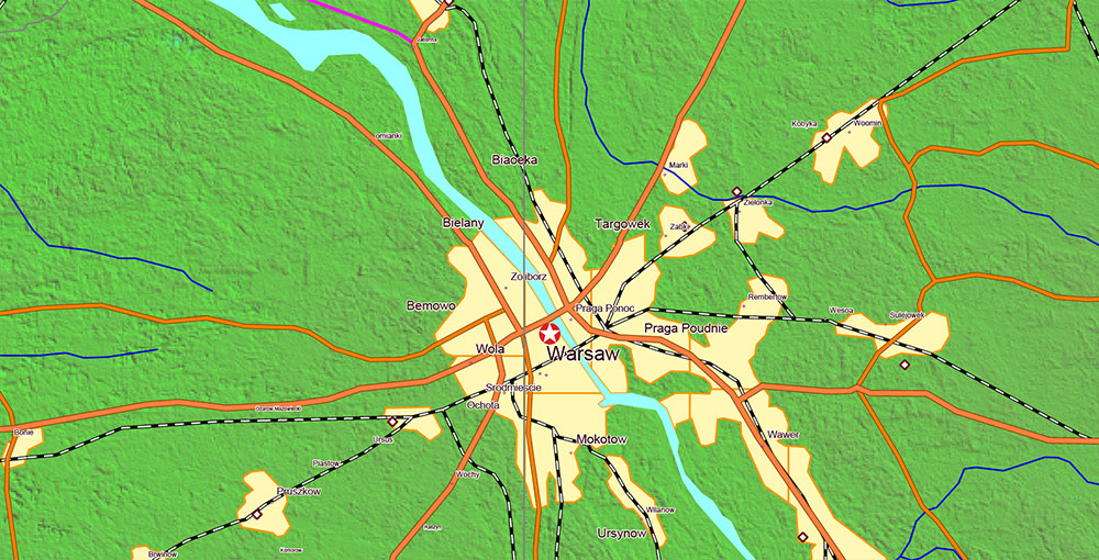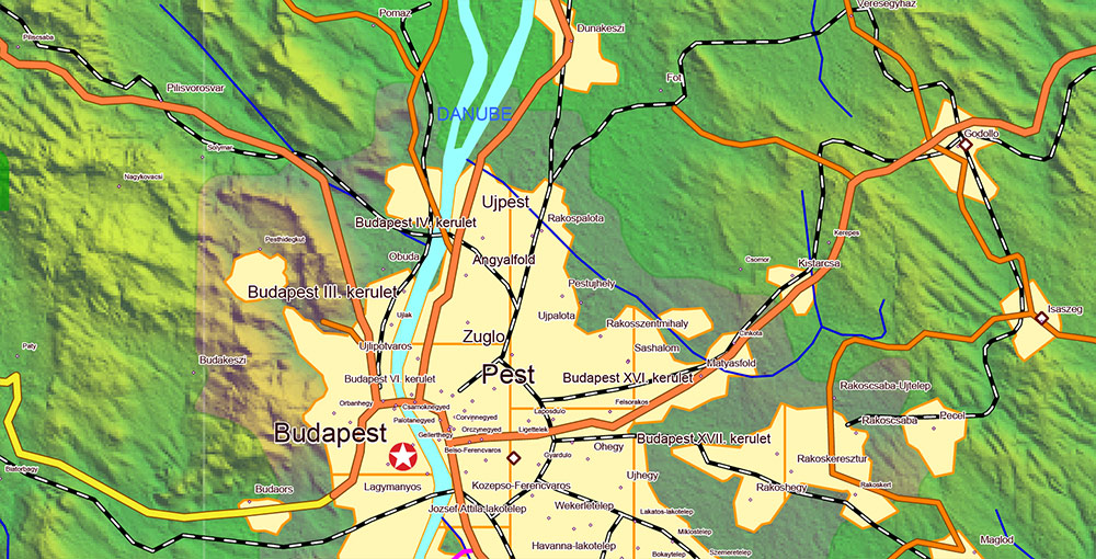 Main and secondary roads, railroads, Shaded Relief Raster. Map for design, printing, arts, projects, presentations, for architects, designers and builders, business, logistics, education.
