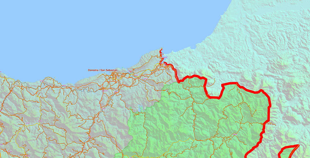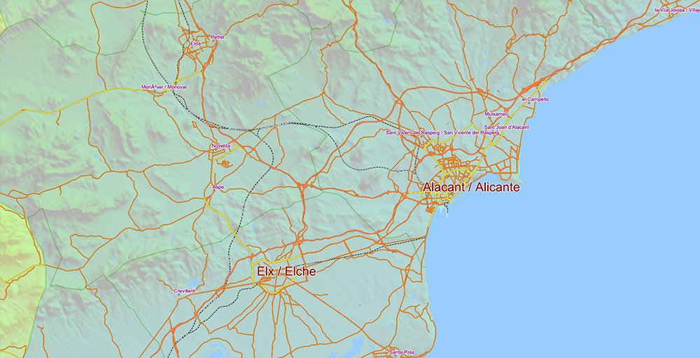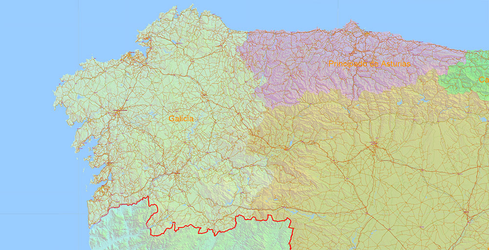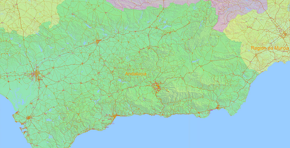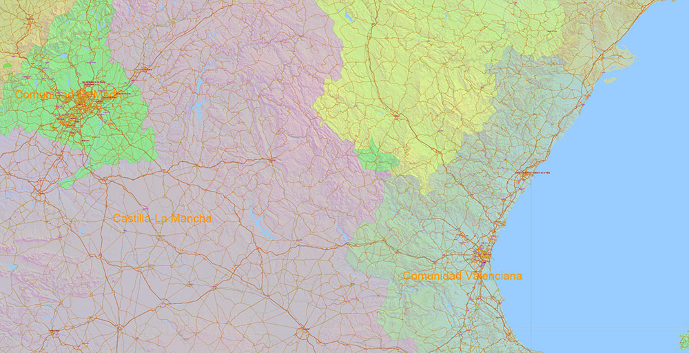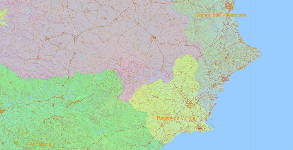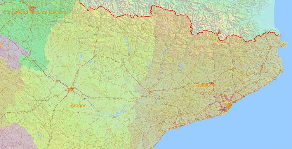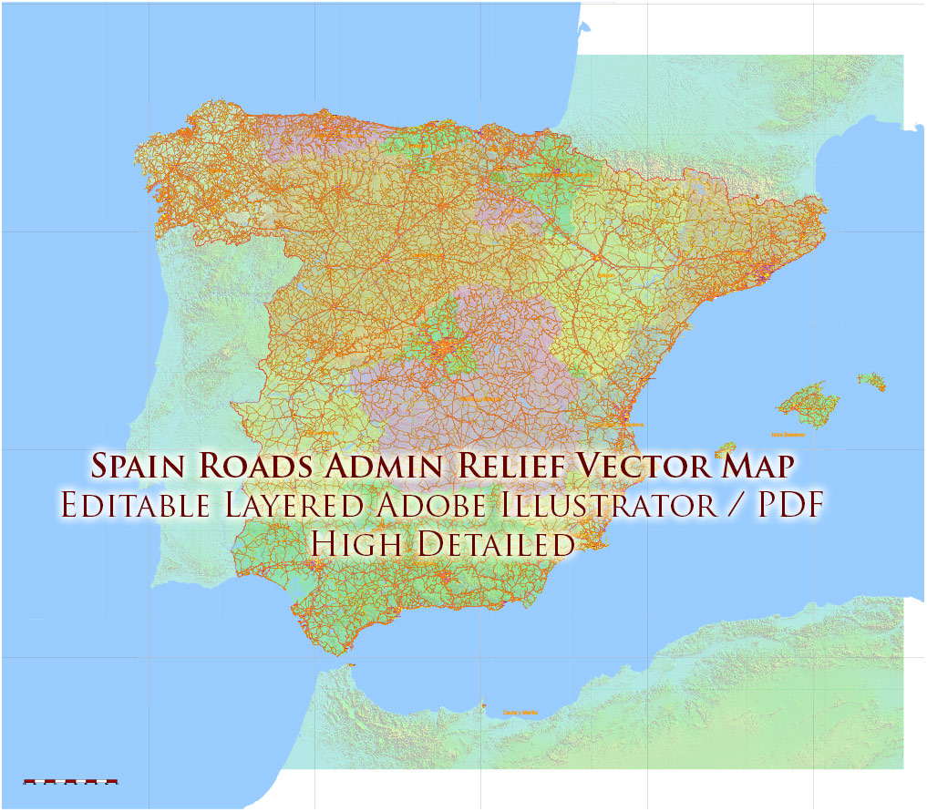 Printable Vector Map Spain, – Roads, Relief and Admin High Detailed Map in Mercator Projection fully editable, Adobe Illustrator in layers, full vector, scalable, curves/text format names, 237 mb ZIP
