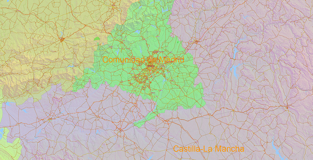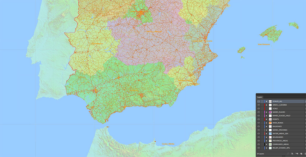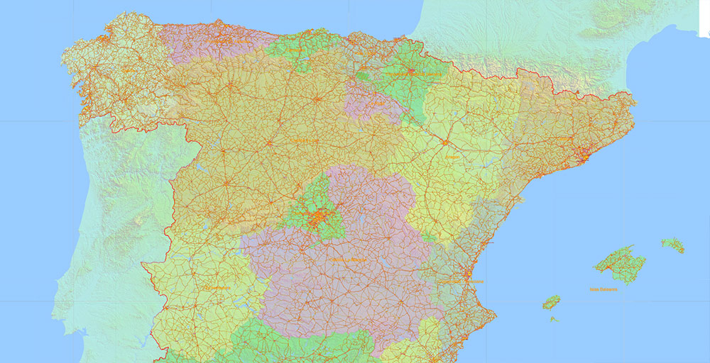 Spain Vector Map – Main Roads, Relief and Admin High Detailed Map, printable vector map Adobe Illustrator editable Layered